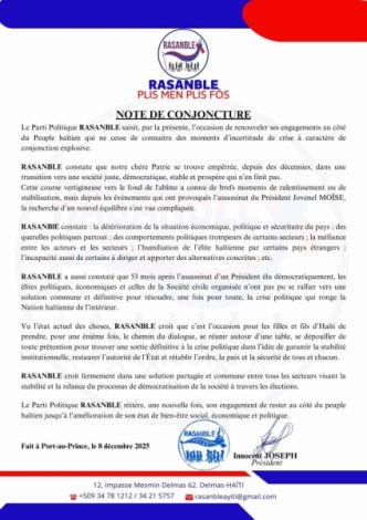 Haïti politique : Le parti Rasanble ne mâche pas ses mots face à la situation qui sévit en Haiti