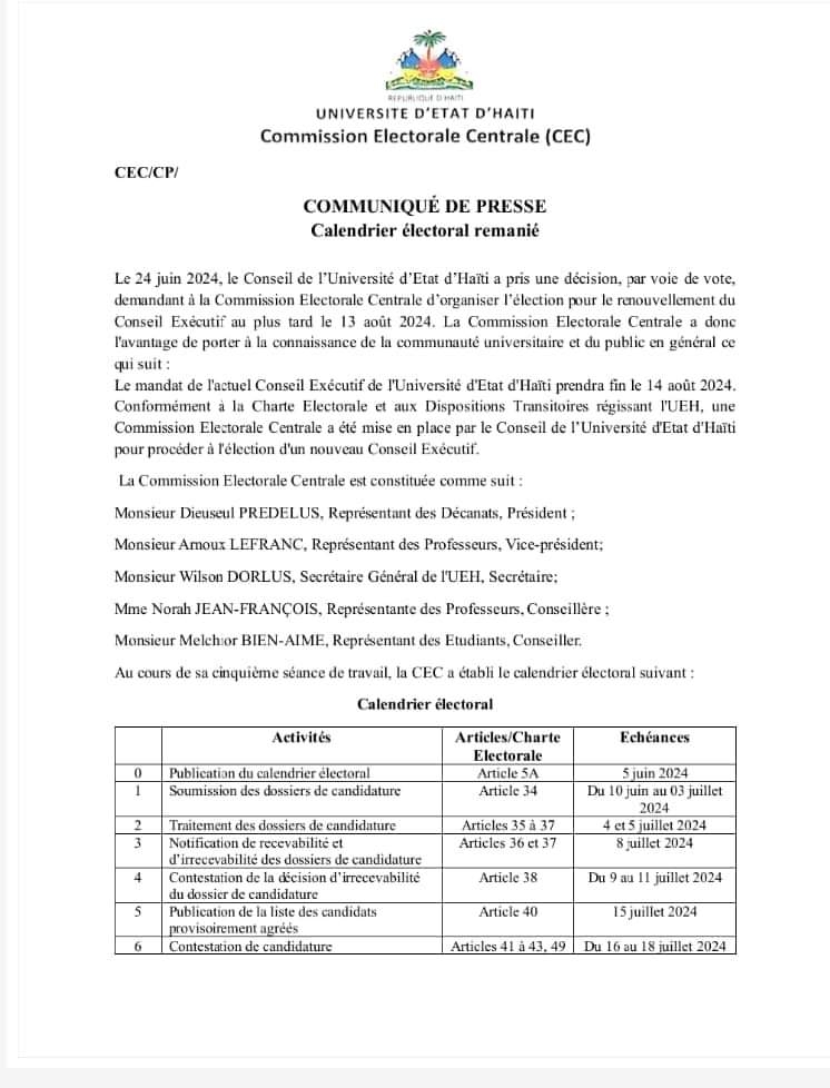 POLITIQUE CALENDRIER ÉLECTORAL REMANIÉ POUR LE RENOUVELLEMENT DU CONSEIL EXÉCUTIF DE L’UEH La Question Suivre sur Twitter Envoyer un courriel 25 juin 2024 Moins d’une minute Partagez l'infoLire aussi: Les malheurs d'Haïti de 1893-2022, rien n'a changé dans ce pays de misère noire Votre navigateur ne prend pas en charge la lecture des vidéos. TagsÉlections ueh La Question Suivre sur Twitter Envoyer un courriel 25 juin 2024 Moins d’une minute