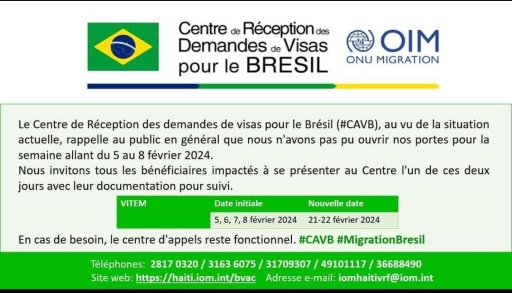 Pendant plusieurs jours, les portes du Centre de Réception des Demandes de Visas pour le Brésil, géant économique en amérique du Sud étaient fermées à cause de turbulences politiques précédemment annoncées pour les 5,6,7 et 8 Février dernier. Les activités étaient au point mort au Centre de Réception des Demandes de Visas pour le Brésil (CAVB).
