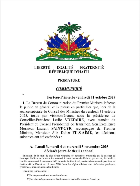 Port-au-Prince, 31 octobre 2025 — Le Gouvernement haïtien a annoncé ce vendredi, à travers un communiqué officiel de la Primature, la proclamation de trois jours de deuil national à la suite du passage dévastateur de l’ouragan Mélissa, qui a causé la mort de plus d’une vingtaine de personnes à travers le pays.