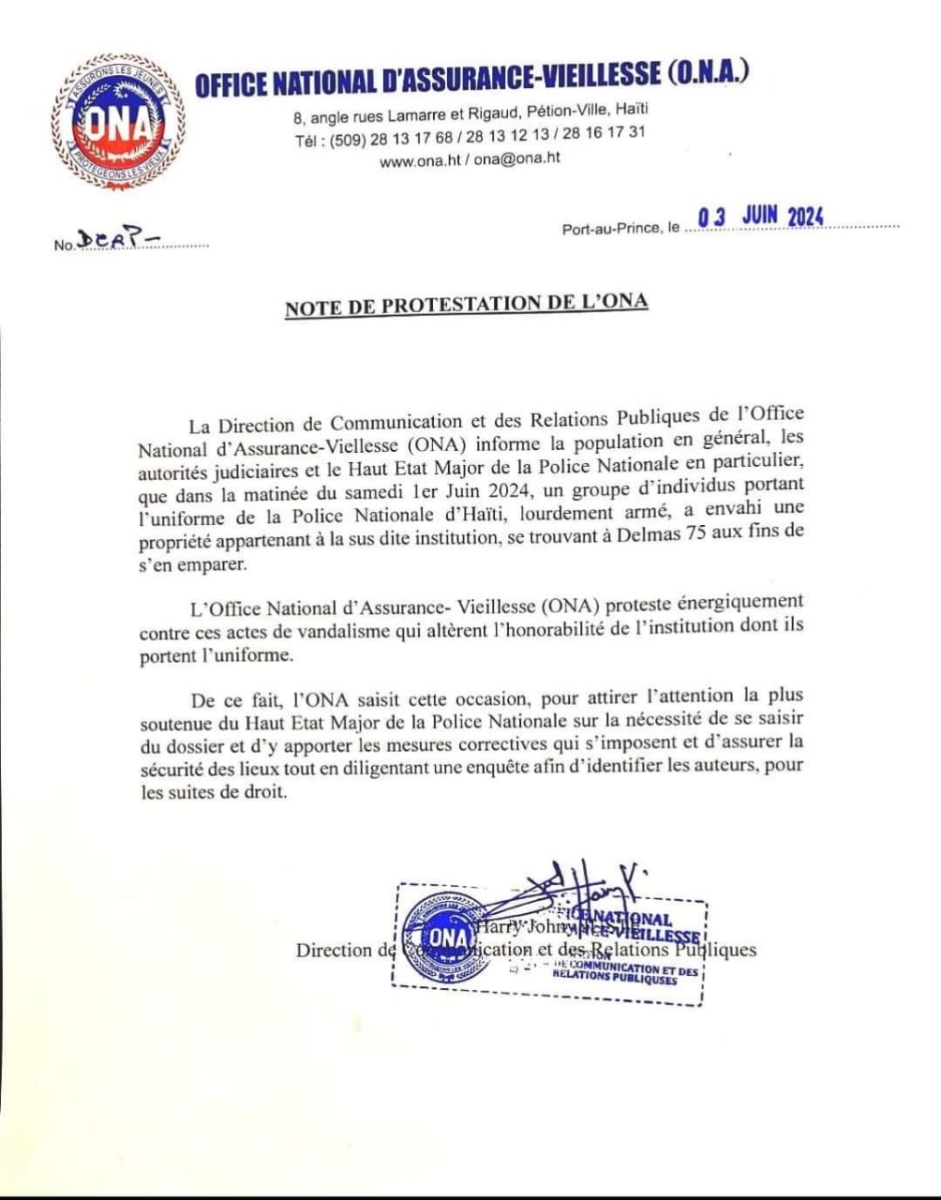Dans une note de protestation émise le 3 Juin dernier, l’Office Nationale d’Assurance Vieillesse (ONA) s’insurge contre des hommes en uniforme de police lourdement armés qui se sont introduits, le 1er juin 2024, sur une de ses propriétés située à Delmas 75, dans la région métropolitaine de Port-au-Prince. Par cette note, l’institution voulait non seulement protester contre ces agissements mais aussi attirer l’attention du haut état major de la Police Nationale d’Haïti.