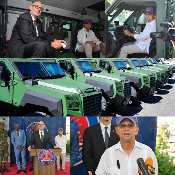 Port-au-Prince, 8 novembre 2025 — Le Premier ministre Alix Didier Fils-Aimé, accompagné du Conseiller-Président Leslie Voltaire, a remis officiellement sept véhicules blindés aux Forces Armées d’Haïti (FAd’H) au cours d’une cérémonie solennelle organisée à la Primature.