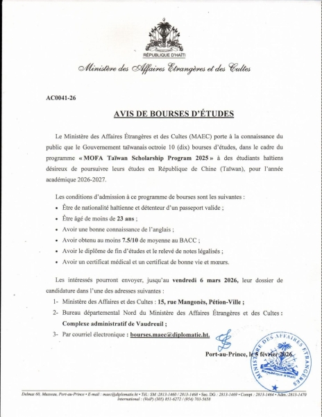 Port-au-Prince, 5 février 2026 — Le Ministère des Affaires Étrangères et des Cultes (MAEC) a annoncé l’ouverture officielle du programme « MOFA Taïwan Scholarship Program 2025 ». Cette initiative du gouvernement taïwanais offre dix bourses d’études à des étudiants haïtiens pour l’année académique 2026-2027.